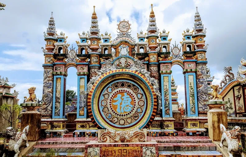 Ancient motifs of such mascots such as dragons, unicorns, and phoenixes served only for the emperors, now we can see them in many graves here. On the stone steps, the mascots are both majestic and mighty guarding the tombs. An Bang Cemetery Vietnam will make you overwhelmed by the many regal stone lions and phoenixes carved on the roofs.