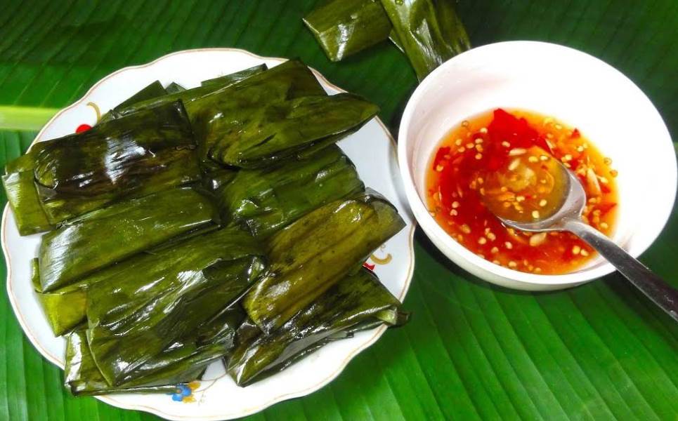 Banh Nam– Steamedshrimp rice cake in banana leaf.