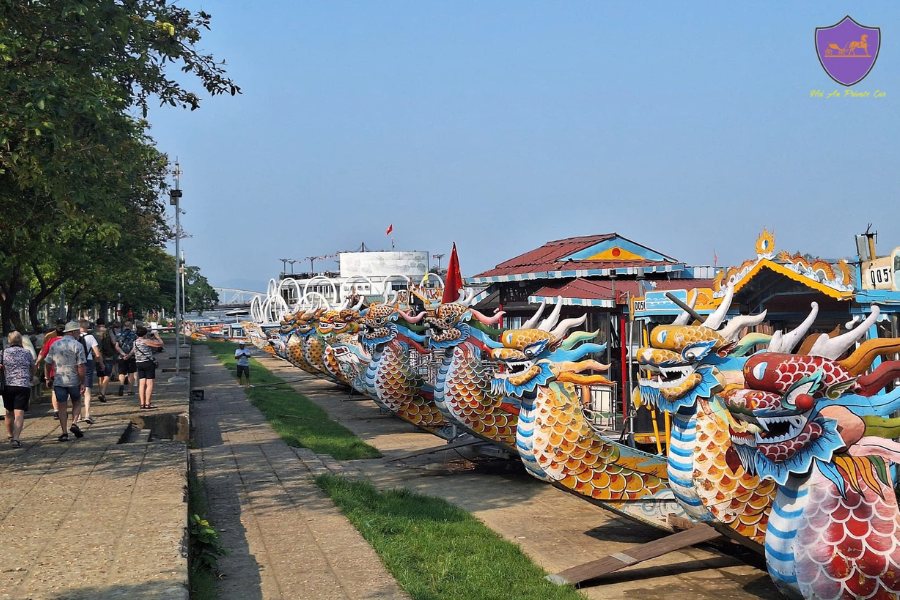 Around 5:20 PM, we will arrive at the wharf and board the Dragon Boat, a vessel that once served the Kings of ancient times. As we glide along the picturesque Perfume River, you will have the opportunity to admire fascinating historical sites, such as the ancient dragon boat wharf and Truong Tien Bridge, all set against the beautiful hues of the sunset.