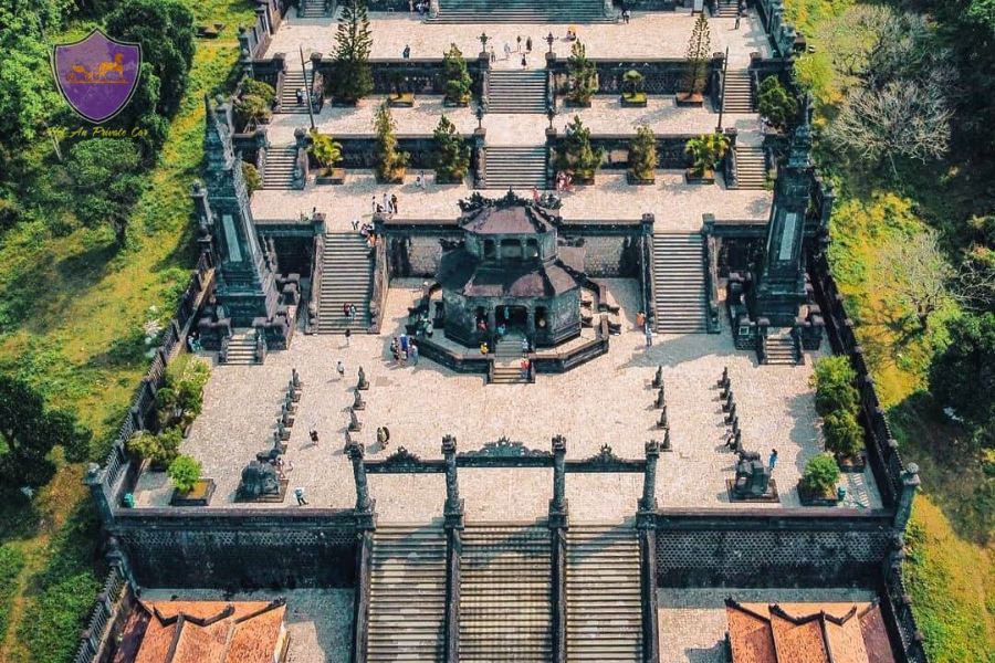 Khai Dinh Tomb: Before entering Hue city center, you will drop by the most distinctive of the 7 royal tombs in Hue, the tomb of Khai Dinh Emperor. Its prominence lies in the clever mixture of various architectural styles in Vietnam and foreign countries. Furthermore, its decorations stand out with bronze statues, mosaics, sophisticated paintings, etc. Plus, the tomb’s setting amidst a lush hill emphasizes the visitors’ experience.